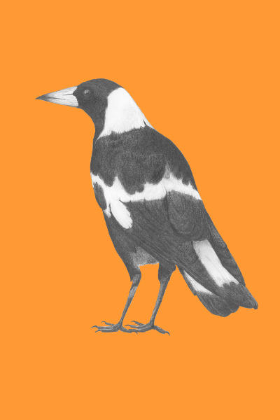 The Black-backed Magpie (Gymnorhina tibicen) is a common bird in many parts of Australia. Magpies feed on worms, insects and spiders and can often be seen on the ground foraging for food. Magpies' warbling and melodious calls to each other establish territories and are the reason for its specific epithet of "tibicen" which means flute player.